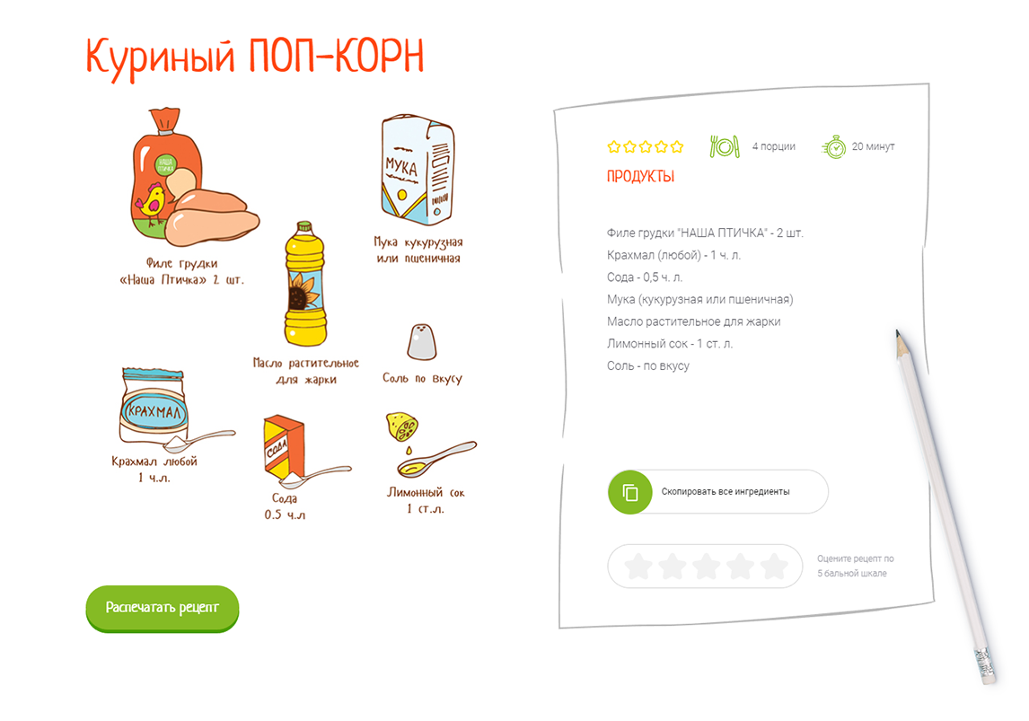 Макет был утвержден, но с бренд-менеджером Татьяной мы решили добавить функциональные возможности. Чтобы пользователь мог скачать инструкцию по приготовлению, оценить рецепт и в один клик скопировать в буфер обмена
