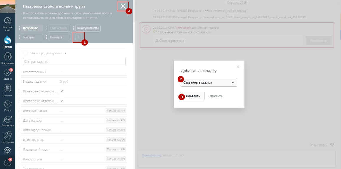 Если вкладка «Связанные сделки» не появилась, то администратору нужно перейти в панель настроек карточки сделки и добавить закладку «Связанные сделки» из доступного списка. Нажатием на знак крестика завершить настройку.