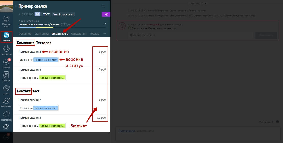 Виджет отображает информацию в реальном времени, т.е. при изменении названия, статуса и бюджета по сделке, актуальные данные также появляются в блоке «Связанные сделки».