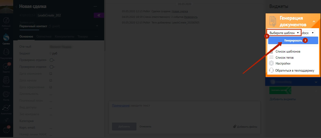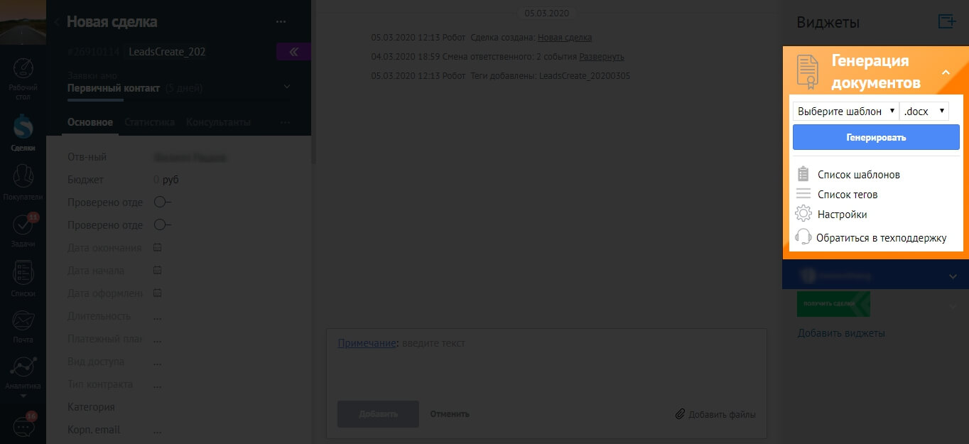 Интерфейс располагается в боковой панели виджетов в правой части экрана карточки контакта или сделки. Состоит из пяти разделов: