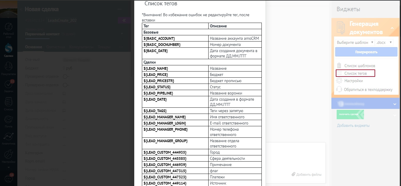 В разделе Список тегов представлена таблица с тегами и названиями полей соответствующих контакту, компании, элементам списка или сделки, а также данным ответственного менеджера.